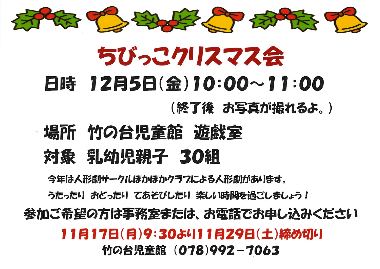 12月5日(金)ちびっこクリスマス会のお知らせ 2025/11/10 今年も乳幼児親子向け『ちびっこクリスマし会』を開催します。申込みは11月17日(月)9時30分開始です。みんなで楽しくクリスマスの思い出を作りましょう♪