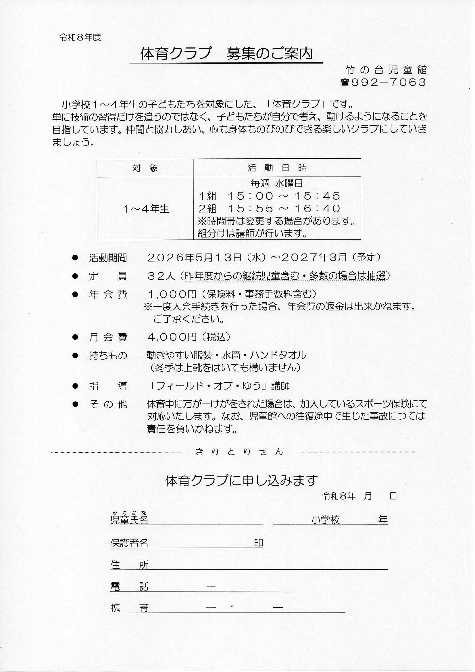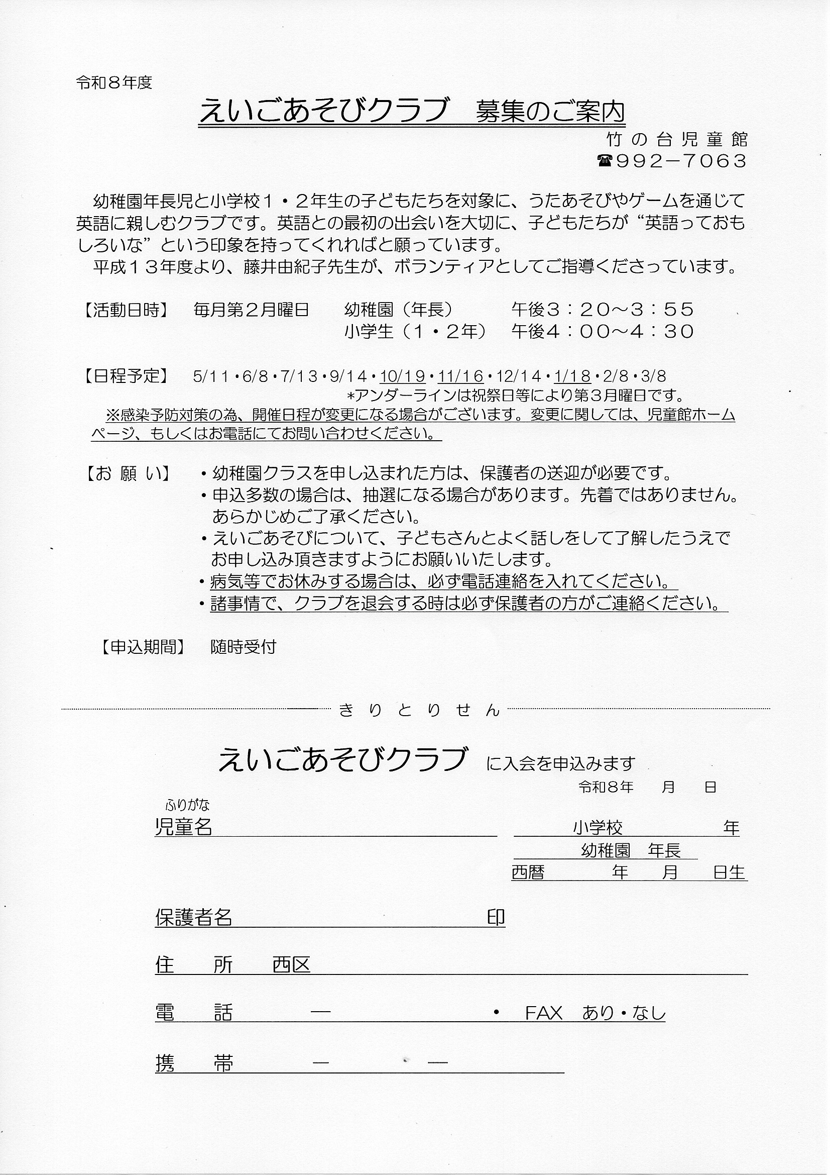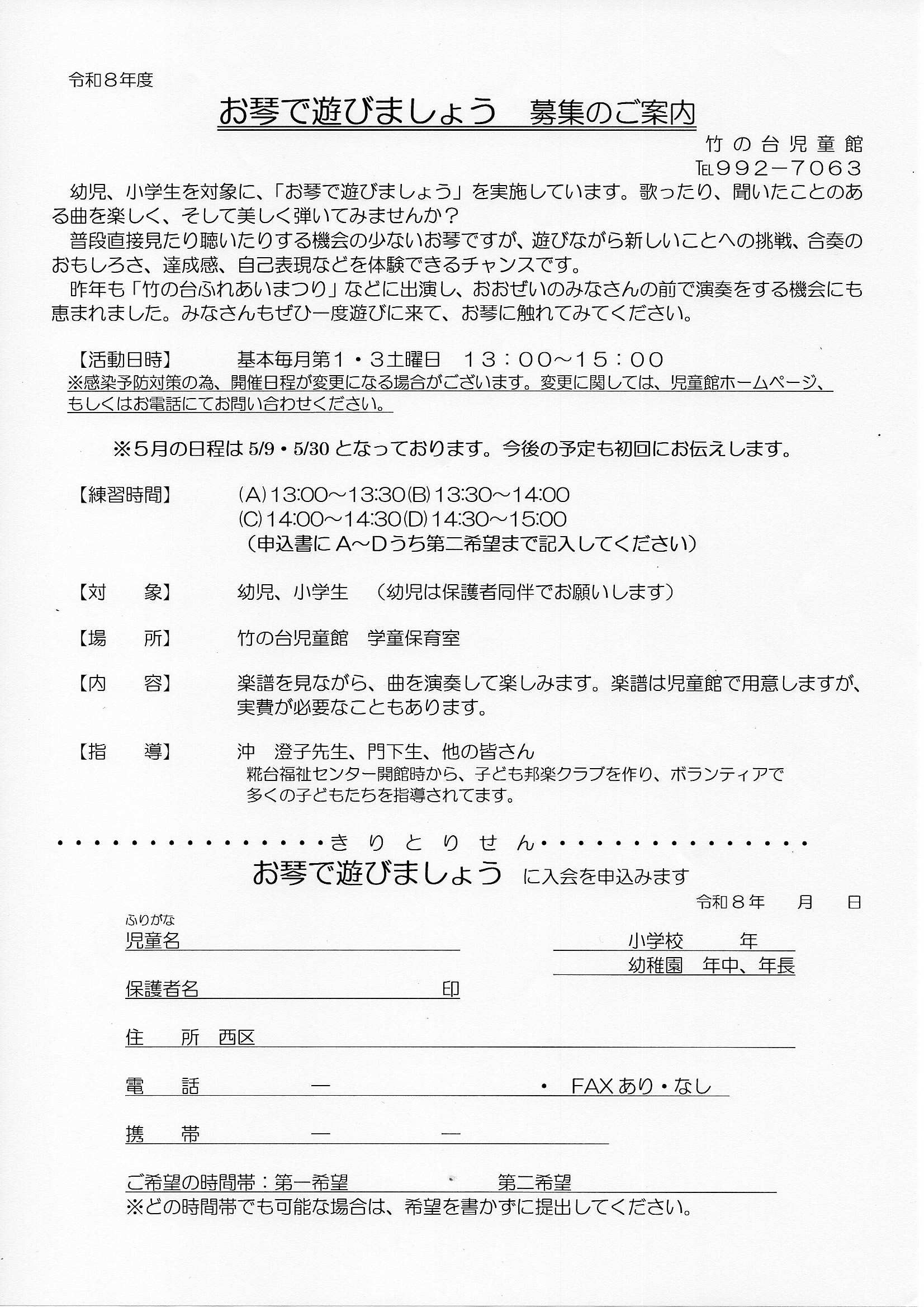竹の台児童館 体育クラブ・お琴クラブ・えいごクラブ申込み用紙