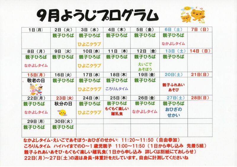 9月のじどうかんだよりに更新いたします。『親子ふれあいあそび』や『管理栄養士さんのもぐもぐ楽しい離乳食』など行事もたくさん!ご案内を確認していただきお申込みください!