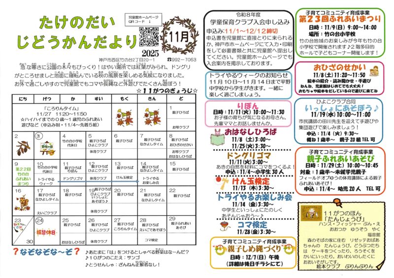 いよいよ秋本番!暑さと寒さを繰り返し自然の色どりが変化していく季節です。学童保育申込みが11月1日(土)から開始されます。締切が12月12日(金)までですので、期間内に申込みをお願い致します。