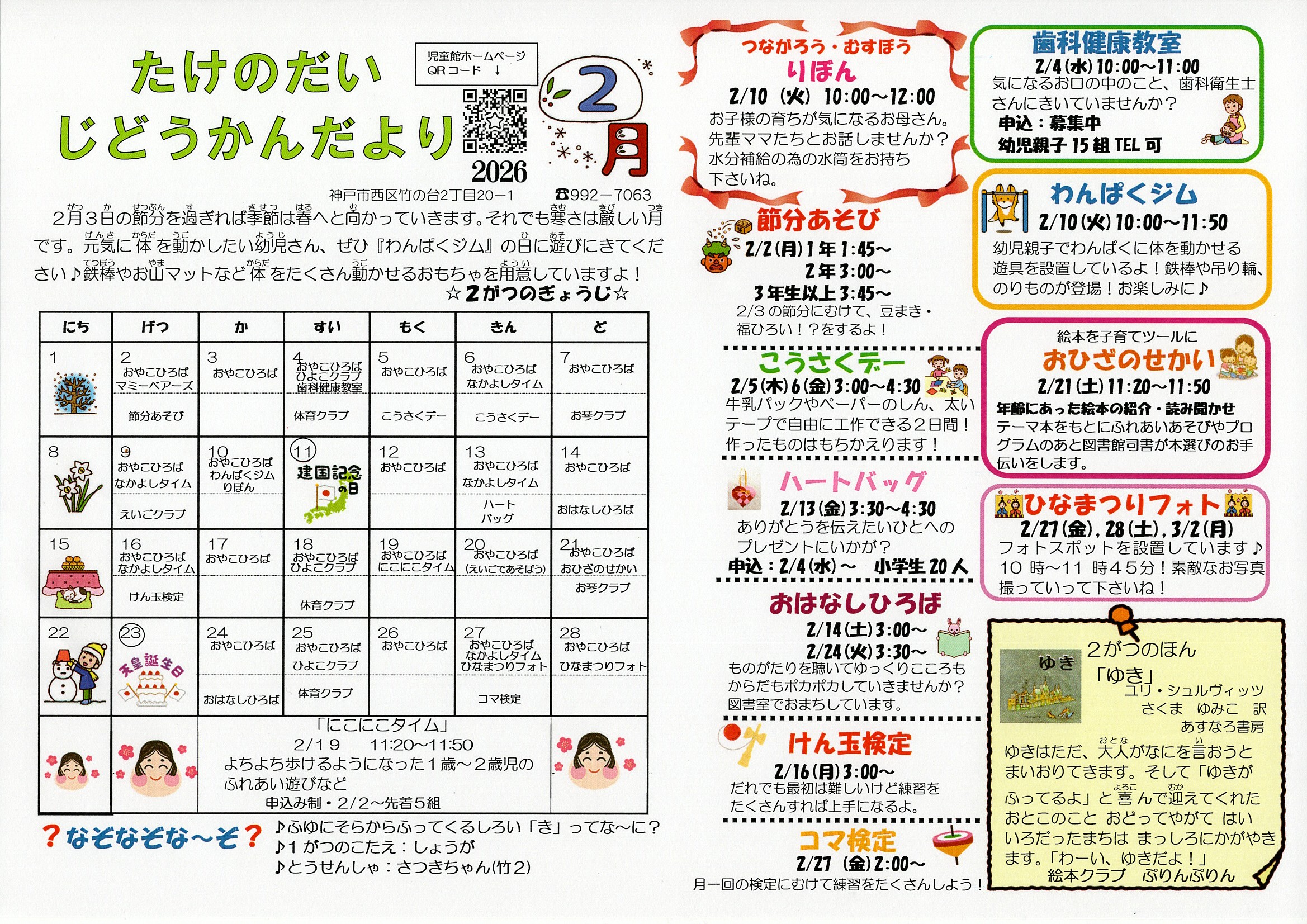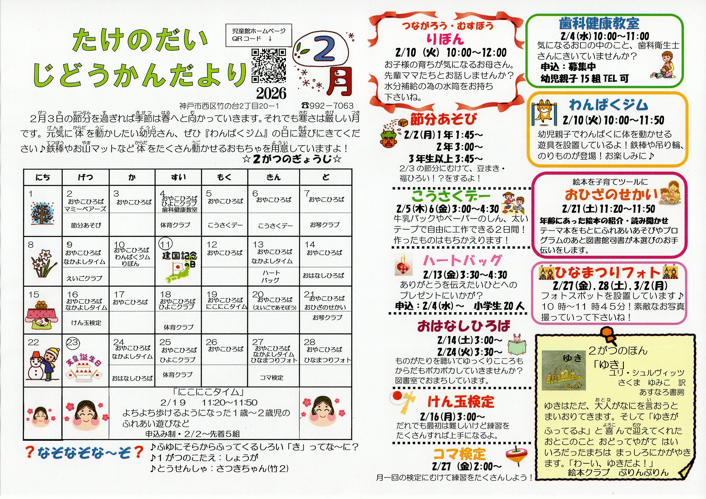 2026年2月の竹の台児童館だよりです!2月2日(月)午後から節分遊びをします。一般来館の小学生も参加できるので、ぜひ遊びにきてね♪