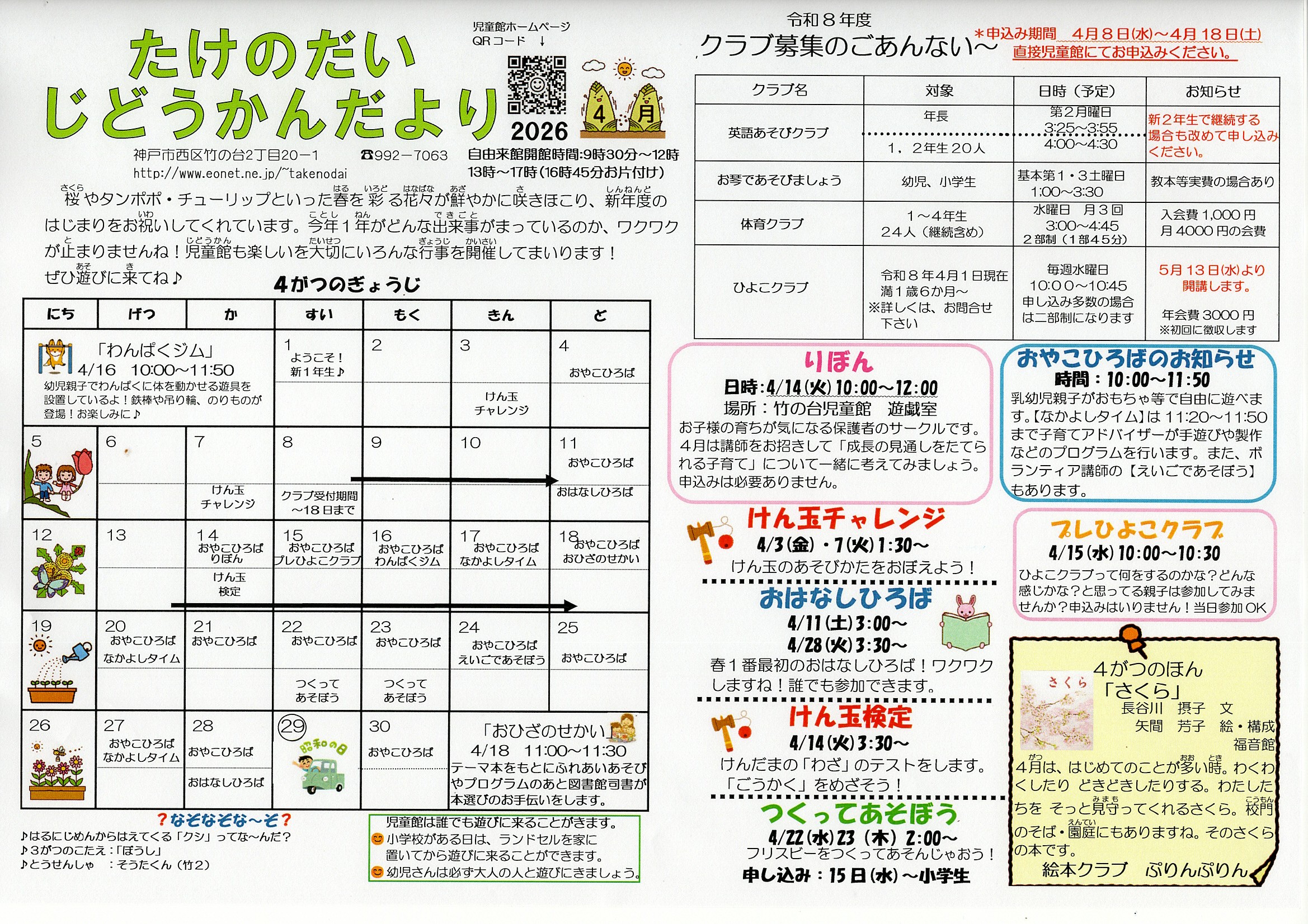 4月8日(水)から各クラブの申込みがはじまります。申込み用紙は児童館にて8日(水)9時30分~配布いたしますので、児童館まで直接取りに来ていただきお申込みください。
