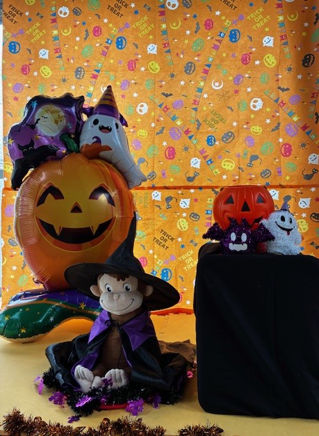 おさるのぬいぐるみが座っている場所にお子様を座らせて撮影できるスポットです!簡易的な変身グッズも置いているので自由に貸し出しいたします。